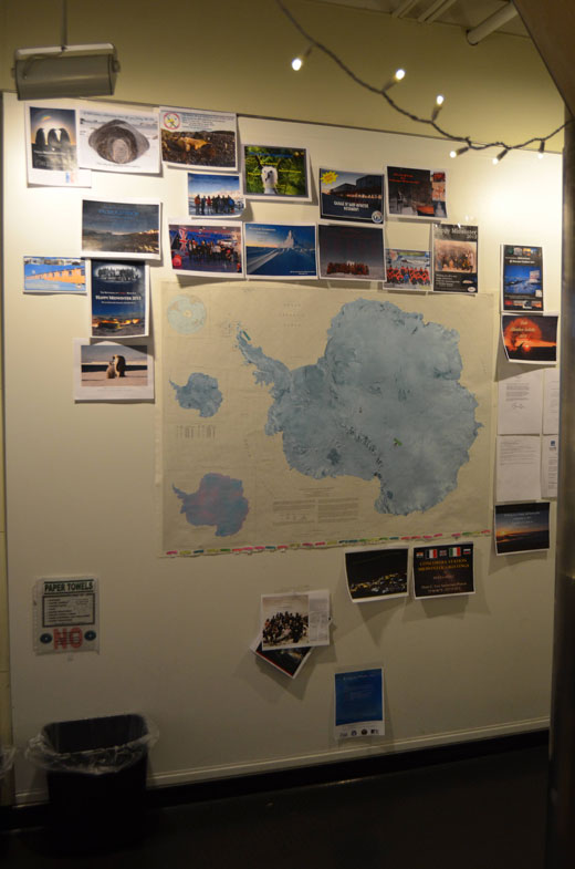The official midwinter date is a big event in Antarctica. The various stations throughout the continent celebrate and exchange special greeting cards, as shown posted on a wall at the Amundsen-Scott station where the IceCube winterovers are located. There they had dining, dancing and a movie (the traditional viewing of “The Shining”) to cap off their weekend celebration. And auroras, of course.